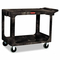 Won't rust, dent, chip or peel. Lightweight for easy maneuverability and quiet operation. No sharp edges to nick walls or furniture. Flat shelves provide a smooth worksurface and allow easy loading. Compatible with Optional Refuse/Utility Bins RUB-335388BLA and RUB335488BLA (sold separately). Color(s): Black; Width: 26 in; Depth: 44 in; Height: 33.3 in.