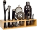 1.20 Piece Stainless Steel Shaker Set. Bar-grade cocktail mixer shaker 25oz (750ml), twisted spoon, muddler, double jigger, ice tong, Hawthorne strainer, fine mesh strainer, 2 wine stoppers, 2 pouning spouts, corkscrew, 2 straight drinking straw, 2 drinking straw, straw cleaning brush, velvet bag, natural bamboo stand, cocktail receipt pages.