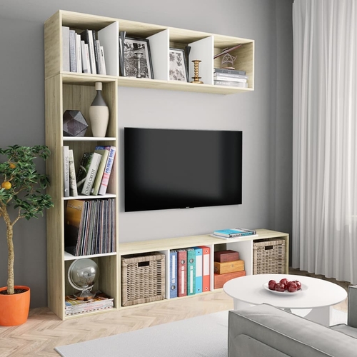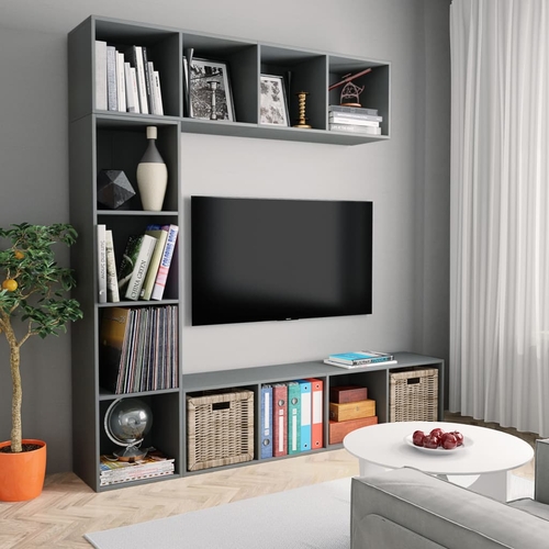 The set consists of 1 TV cabinet,1 book shelf and 1 wall mounted cabinet and designed with 12 compartments, offering ample storage space for keeping your magazines, books, DVDs and multimedia devices well organised and within reach.