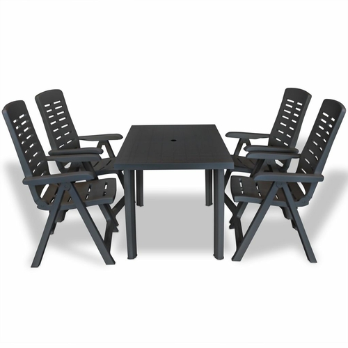 The garden table has an umbrella hole so that you can use it with an umbrella and keep cool in the shade. The chairs' backrests have 4 reclining settings, so you can always find the most comfortable position. The chairs can be folded to save space when not in use. The set is made of durable plastic, making the table and chairs weather resistant and easy to clean. This outdoor dining set is also lightweight, which makes it easy to move around.