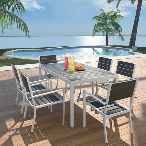 This dining set has a powder-coated 100% aluminum frame, making the table and chairs lightweight and easy to move around. The tabletop, chair seats and chair backrests are made of weather-resistant and easy-to-clean WPC, which makes them sturdy and durable. These chairs can be conveniently stored underneath the table to save space when not in use.