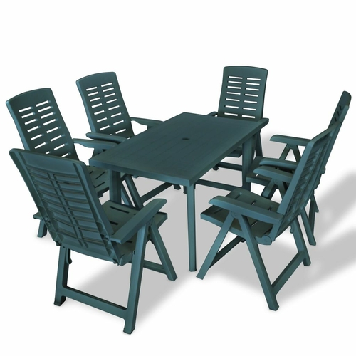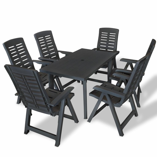 The garden table has an umbrella hole so that you can use it with an umbrella and keep cool in the shade. The chairs' backrests have 4 reclining settings, so you can always find the most comfortable position. The chairs can be folded to save space when not in use. The set is made of durable plastic, making the table and chairs weather resistant and easy to clean. This outdoor dining set is also lightweight, which makes it easy to move around.