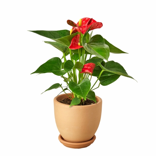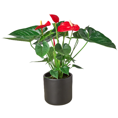 The Anthurium 'Red' is commonly referred to as the painted anthurium, flamingo flower, tailflower, painter's palette, and laceleaf. Its vibrant appearance makes it a popular choice for indoor decoration, whether in homes, offices, or commercial spaces. The plant can be used as a focal point in a room or as part of a larger arrangement.