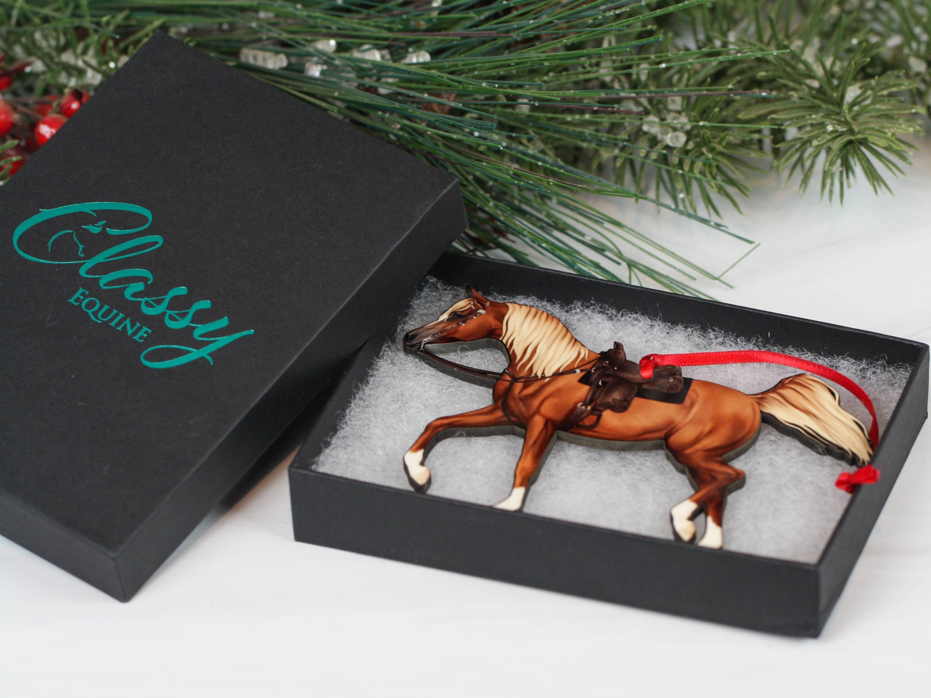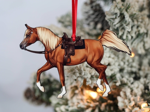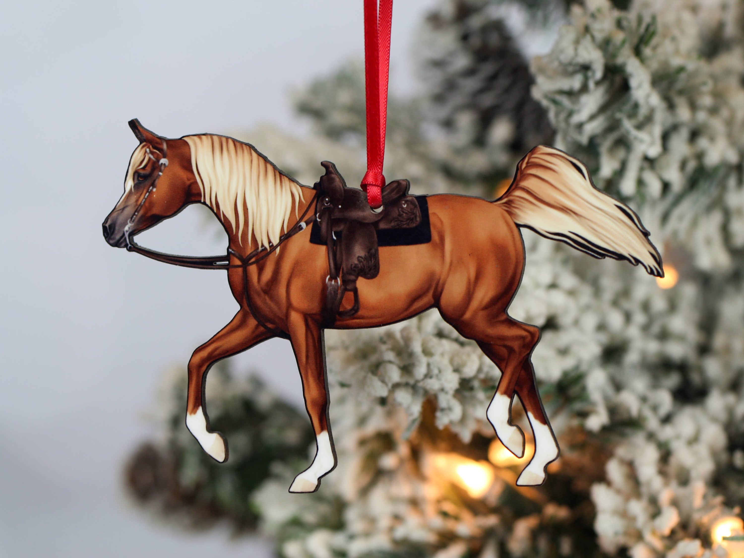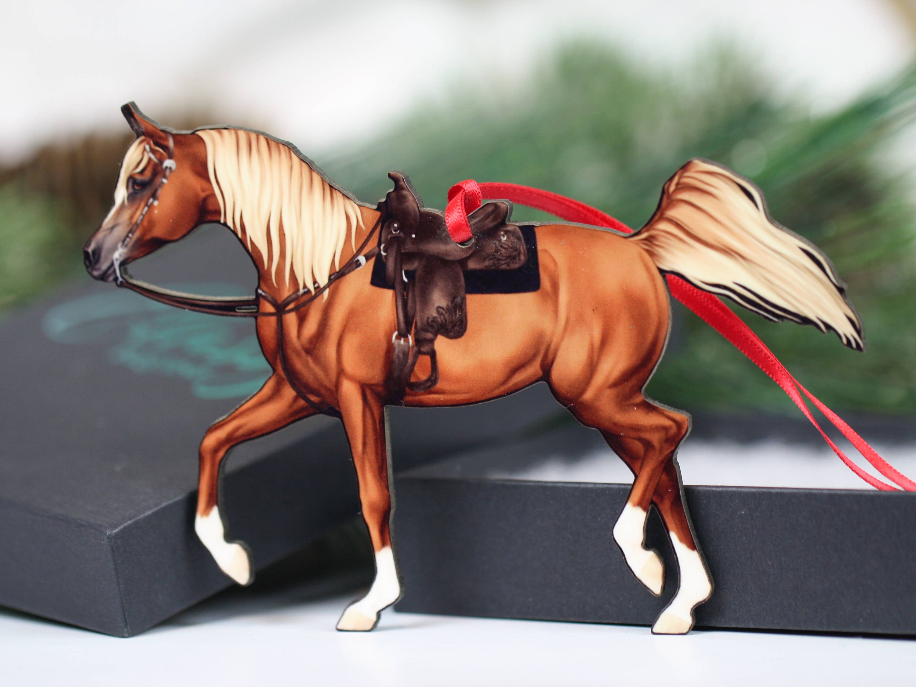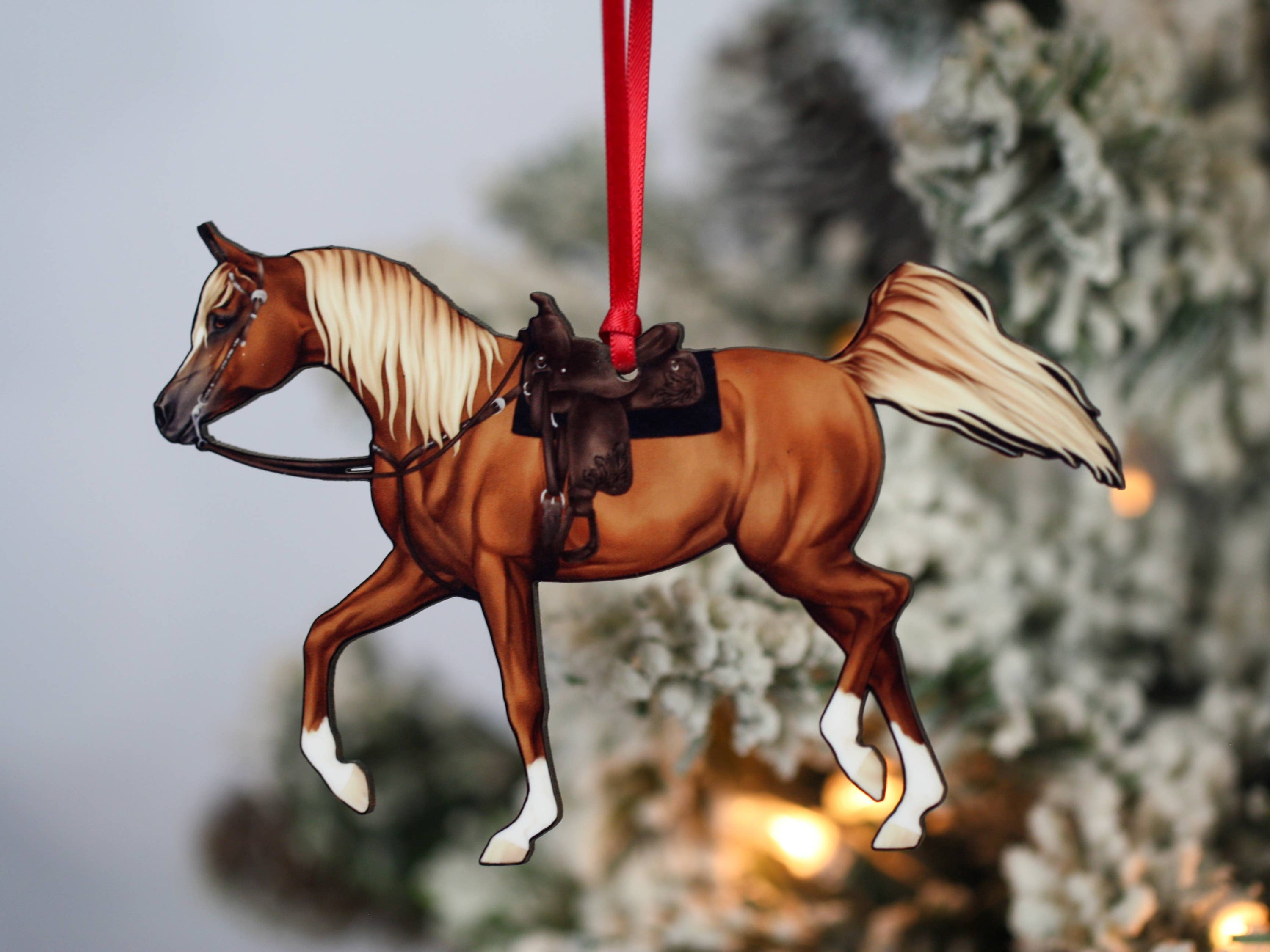 This exquisite ornament features a flaxen chestnut Arabian horse, tacked up for western riding, showcasing the beauty and grace of this magnificent breed. The attention to detail in the design reflects the artistry of Drop of Equine Art in collaboration with Classy Equine. Each piece is laser cut to perfection, ensuring that every ornament is unique and of the highest quality.