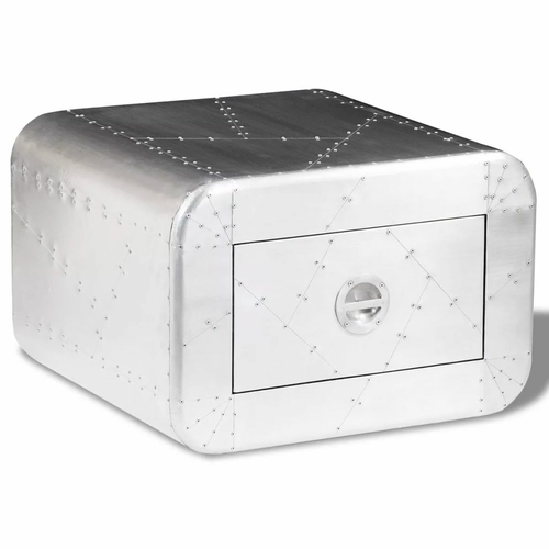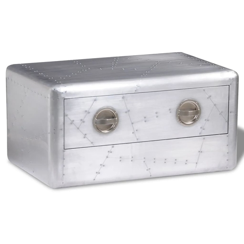 This airmen coffee table is made of solid wood and its surface is clad with a patchwork of polished aluminum panels, accented with exposed steel screws, which makes it extremely durable. Smooth edges and the retro drawer handle give the aviator coffee table a unique look.