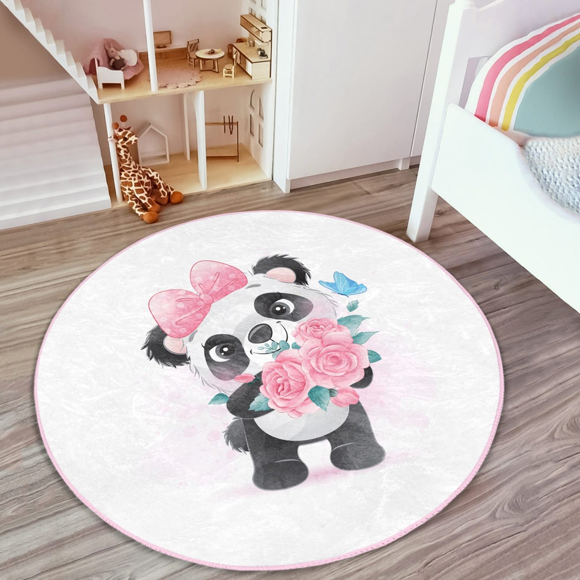 The cute panda pattern is perfect for creating a cheerful atmosphere in your baby girl's room. The round shape of the rug adds a unique flair, making it an eye-catching centerpiece that will surely delight both children and parents alike. The playful design encourages imagination and creativity, making it an ideal choice for a nursery or playroom.