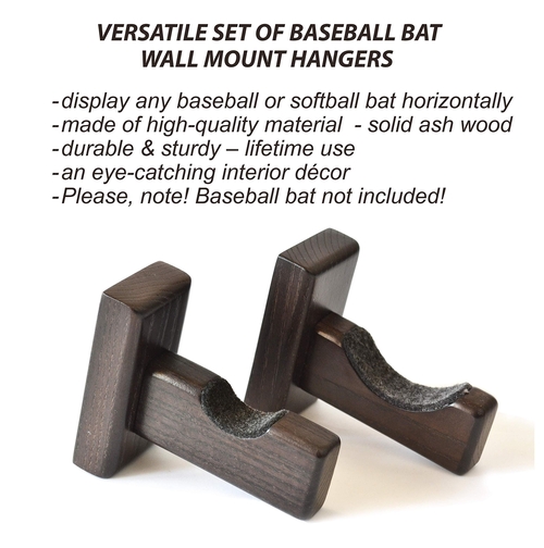 SET OF BASEBALL WALL MOUNT HANGERS. Meet our new compact bat hooks to display any standart-sized baseball or softball bat horizontally. Looking for a way to display your favorite, collectible bat? Weve got you covered! SOLID ASH TREE WOOD. Made of durable and sturdy ash-tree wood, covered with protective varnish, that gives these hangers deep and stylish ebony color. Convenient cutouts on each hanger for different ends of a bat, covered with felt for protection and fixation. WALL MOUNT WITH HIDDEN SCREWS (HARDWARE INCLUDED). Detailed instructions are included along with the Screws and Anchors for a fast and easy installation Dimensions (1 hanger) 4,31,83,5 Please, note! Baseball bat not included! 100% SATISFACTION GUARANTEE & LIFETIME USE. Make your bat an eye-catching display to all your guests and have easy access to grab it whenever you need it! PERFECT GIFT TO ALL BASEBALL FANS! Packed in a sturdy gift box set of wall mount hangers will be an amazing gift to everybody, whos in love with baseball your friend, colleague, Father, Brother, well EVERYBODY! Dimensions (1 hanger) 4,31,83,5