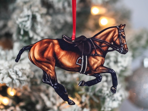 Introducing the Bay Polo Pony Christmas Ornament, a stunning piece of handcrafted equestrian decor that captures the spirit of the polo field. This beautifully designed ornament features a galloping bay polo pony, making it an ideal addition to any horse lover's holiday decorations. With its intricate details and vibrant colors, this ornament is sure to be a cherished item for years to come.