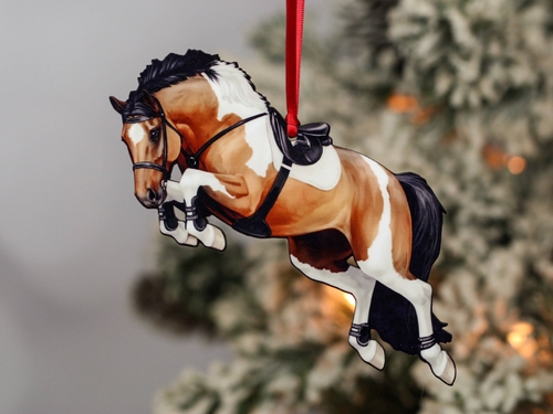 This jumping horse ornament is available in a variety of stunning colors, including bay, seal bay, bay spotted Appaloosa, black, black and white tobiano, chestnut, chestnut and white tobiano, dapple gray, white/light gray, buckskin, and palomino. This wide range of options allows you to choose the perfect ornament that resonates with your personal style or matches your horse's coloring.