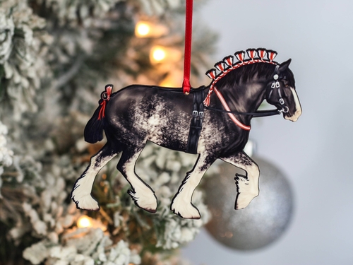 Introducing the exquisite Black Sabino Shire Draft Horse Christmas Ornament, a stunning piece of handcrafted decor that captures the majestic beauty of the Shire breed. This ornament is not just a festive decoration; it is a tribute to equestrian elegance and craftsmanship. Made from high-quality composite wood, this ornament is designed to last, making it a cherished addition to your holiday traditions.