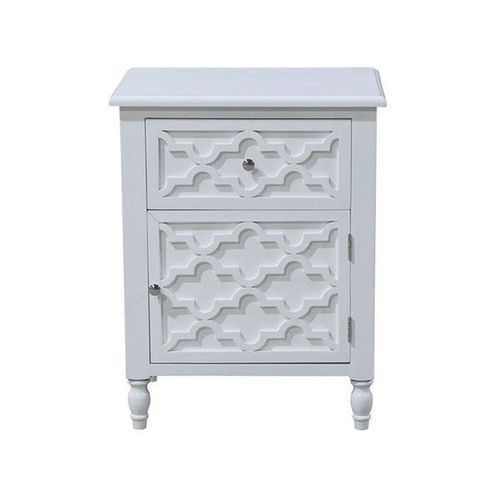 Timber bedside or side table in a white painted finish. A fretwork wooden panel is a charming design feature which provides an overall French rustic look. This Morrocan inspired sideboard is a part of a new trend in decoration. Please be aware all our products are Handmade, slight imperfections are part of the product.
