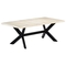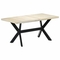 This dining table is made of solid mango wood. Mango wood is a dense and robust hardwood which has beautiful brown or golden streaks and contours on its surface. Rough mango wood not only has the strength to bear the weight, but also stands the wear and tear of time. The dining table is fully handmade and each step of the process is carried out with the greatest care. The steel legs complete the modern look, along with the steel cross frame that contributes to the sturdy construction.
