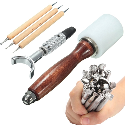 It include: 20pcs printing tools, 1pcs leather carving hammer, 1pcs swivel knife, 3pcs pens.