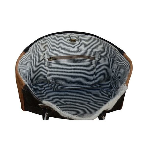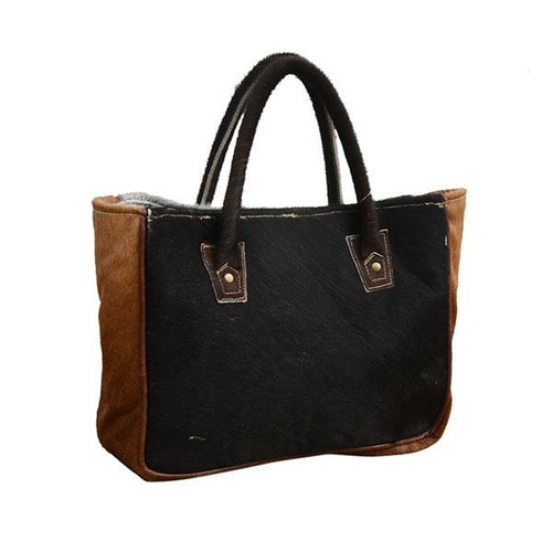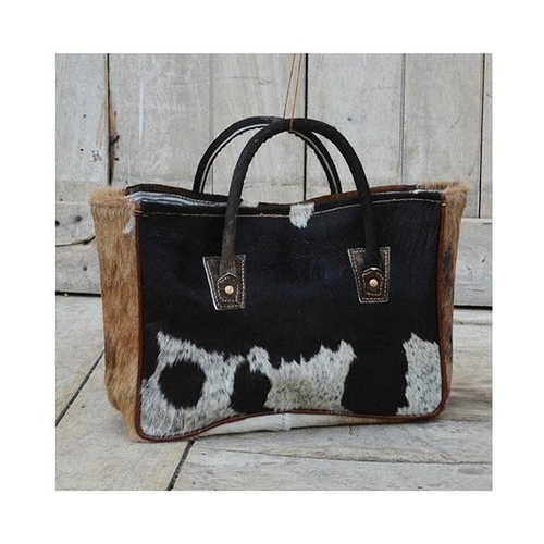 Compact and stylish, our Double Moo Handle It Bag is an eclectic go-to piece. It’s just the right size to fit all your essentials for day wear, and evening wear. It features contrasting light cowhide paneling, a full zipper and short dark chocolate leather handles.