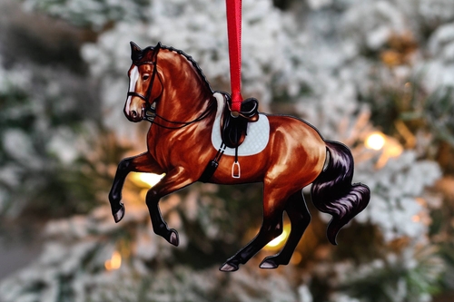 Introducing the exquisite Dressage Horse Ornament, featuring a stunning bay sport horse in a graceful pirouette pose. This ornament is not just a decoration; it is a celebration of equestrian artistry and craftsmanship. Perfect for horse lovers and equestrian enthusiasts, this ornament adds a touch of elegance to any holiday decor.