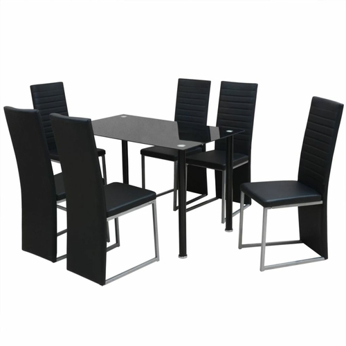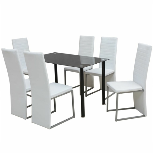 The table top is made of high-strength tempered glass, which is easy to clean. Thanks to the padded seats and backrests, these dining chairs with stylish box legs, offer the utmost seating comfort. The solid powder-coated steel frames are very stable and durable. Assembly is very easy.