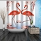 Decorative shower curtains theme. Peaceful digital print of one of the most magnificent birds, the Flamingo. Strong pink colors mix with pinkish flowers and light blue water make this elegant painting an excellent bathroom decor item.