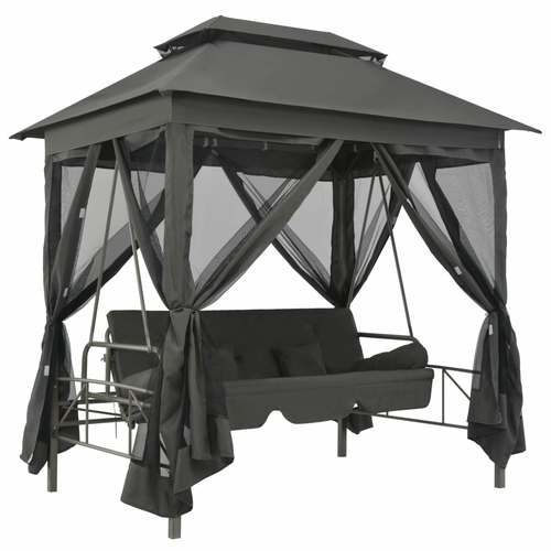 This stylish and spacious gazebo swing bench, featuring a spacious and stylish design, comfortably seats two persons and provides shade from the sun with its large canopy.