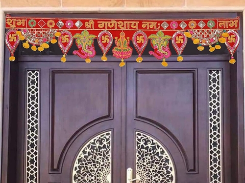 Adorn your entrance with this exquisite handmade velvet Lakshmi-Ganesha bandarwal toran, combining traditional charm and elegance for a warm welcome.