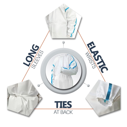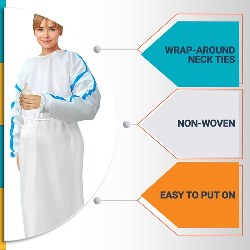 COMFORTABLE & WATERPROOF: Disposable gown is comfortable and easy to put on. Features include elastic wrists, wrap-around neck ties, and extra-long wrap-around waist ties at back. Our disposable lab coats provide waterproof properties against many liquids.