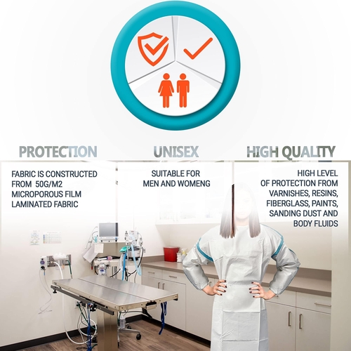 HIGH-QUALITY GOWN: Disposable lab coats for adults are made from polypropylene 50 GSM with waterproof microporous film, which offers medical gown reliable protection from the transfer of dust and body fluids. Microporous film is thermally laminated to a non-woven polypropylene fabric.