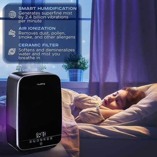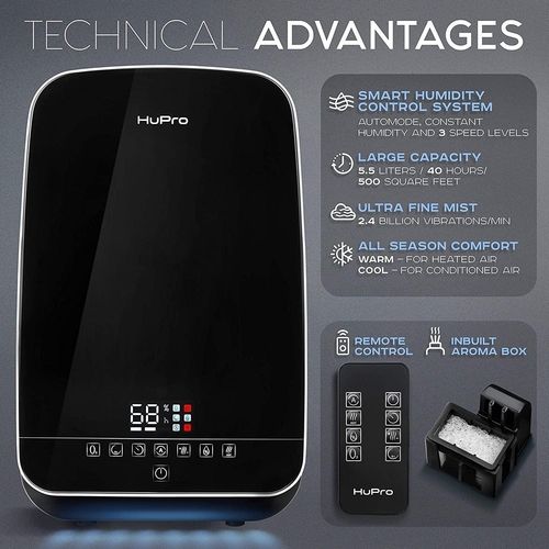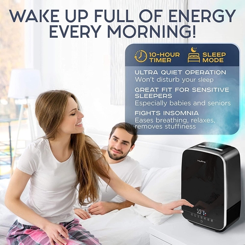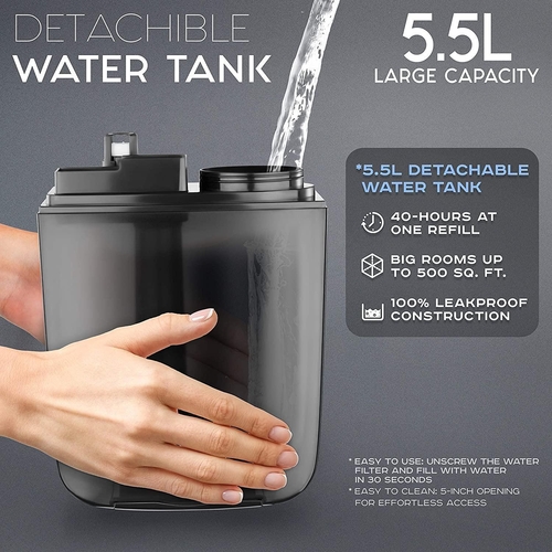 ULTRA QUIET / SLEEP MODE / 10 HOUR TIMER: The large capacity bedroom humidifier produces a near silent frequency (<30dB) for ultra quiet operation. Enjoy a full night of sleep with a night mode. It deactivates all lights and sounds, which is especially importnant for babies, kids, seniors & sensitive sleepers. Use the 10-hour timer to program the hours of operation and save energy. Automatic shut off off when out of water prevents unit damage and keeps you & your family safe. IR IONIZT1ON / CERAMIC FILTER / AROMA BOX for triple purification. Specially engineered ceramic filter with active carbon & mineral pellets purifies water, keeps it fresh & prevents odour. No replacement needed. 100% safe air purification system produces 300 million cleansing ions per min, removing dust, pollen, smoke, & other allergens. Essential oils box fills the room with fresh fragrances. Arom oils rduc strss & nxety, mprve sleep, bst energy and help your mind & body to relax. LEAKPROOF EASY CLEAN DESIGN: Our large room humidifier features a detachable water tank with a secure built-in handle and an extra wide opening for easy filling and cleaning. This user friendly warm mist humidifier will take up to 1 minute of your time for effortless refilling. Requires little to no maintenance. Its reliable construction ensures stable leakproof operation for many years. Provide around-the-clock comfort in your home and office! Improved model 773/2023 More volume 5,5 liters, new filter. Finally say good bye to stuffiness, congested sinuses, dry skin, itchy nose & throat. Keep humidity above 40% to stay healthy. Get more focused & relaxed. Protect hardwood floors & furniture from cracking in the heating season. Buy with confidence!