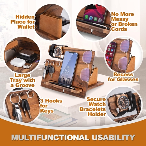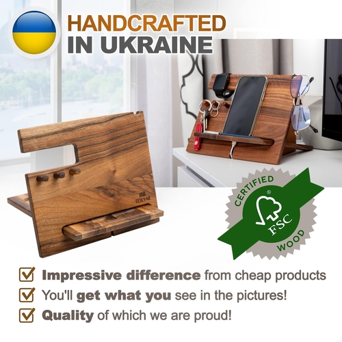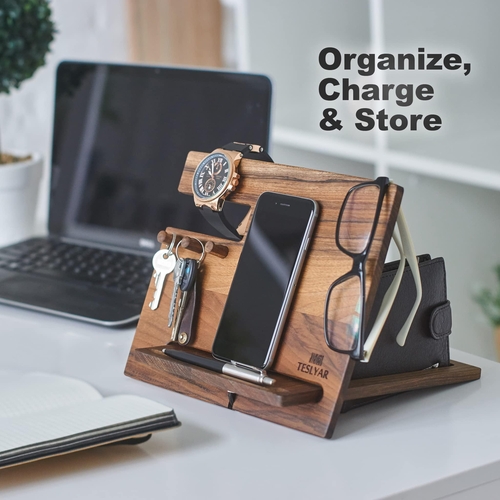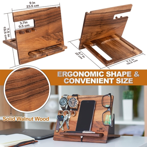 SOLID WALNUT WOOD. This wood docking station is eco - friendly and natural. Walnut is an out-of-competition beacause of the beauty and structure of the wood. This walnut docking station perfectly fits into any interior - both classical and modern styles. Please note: Walnut has a very beautiful and unique coloring - from light brown to dark brown, therefore, the item you bought may be slightly different from the samples on the photo 100% QUALITY. For making these stands the master uses only the best high - quality material. The excellent handcraft has a smooth texture that won't scratch your cell phone. The surface of the stand is treated with a special protective agent for wood, which protects the product from excessive moisture or dryness and prevents all kinds of damage. EASY ASSEMBLY, LIGHTWEIGT, COMPACT, BEST FOR TRAVEL. The stand is easy to assemble, has a light weight and a very compact size - in disassembled form 7.7x9x0.8. Compatible With all kinds of smartphones. The dimensions in assembled form are 9x8.7x6.5 ". It can be used as a stand for a tablet, while adjusting the angle of inclination for the most convenient viewing. Accessories shown in the pictures are not included. ORGANIZE YOUR THE MOST NECESSARY AND EXPENSIVE ACCESSORIES. This stand will become an eye-catching and very practical accessory on your desk. With its help the most necessary and expensive accessories will always be at handy! Convenient cable cutout prevent the cable from overly bending. You can use it as a stand for watching video on tablets. BEST GIFFT IDEA. A perfect gift for any event - For Husband, 5th Anniversary Gift, Graduation Gifts For Him, Gifts For Boyfriend, Gifts For Men, Christmas Gift, Birthday etc. The stand is packed in rustic - style gift box.