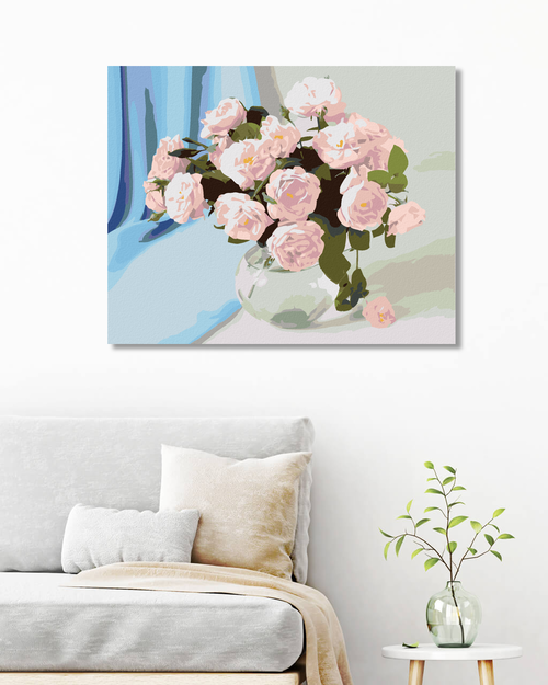 Paint by Numbers - PINK FLOWERS IN A VASE AND BLUE CURTAIN