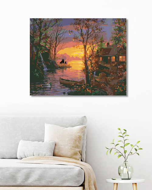 Dropship Paint by Numbers - SUNSET BY THE RIVER, BEARS, DUCKS AND A CABIN