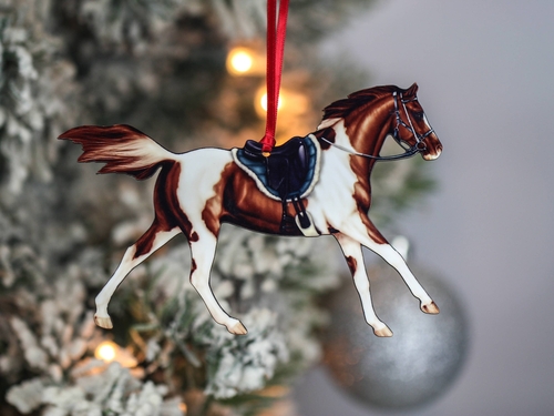 In summary, the Pinto Chestnut Tobiano Endurance Horse Christmas Ornament is a beautiful, handcrafted piece that celebrates the equestrian lifestyle. With its unique design, quality craftsmanship, and versatile display options, it is sure to bring joy to your holiday season and beyond.