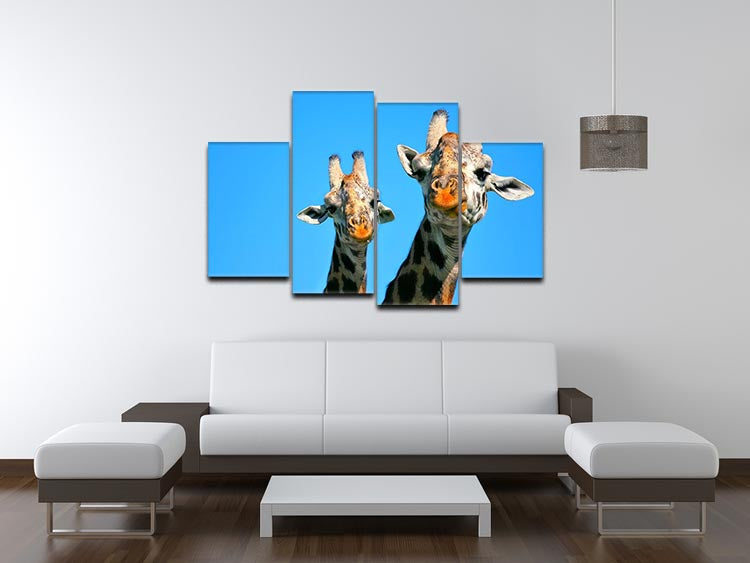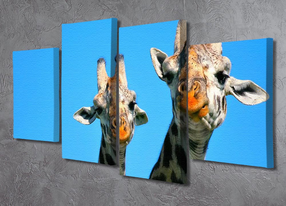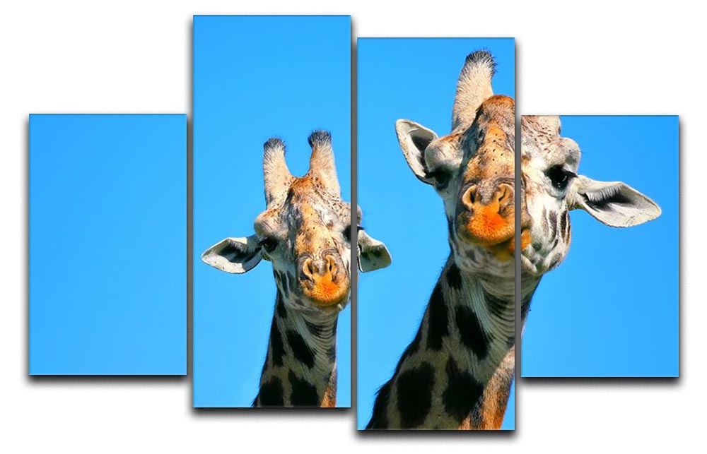 A beautiful 4-split canvas artwork featuring a mother giraffe and her baby in the African savannah, showcasing their bond.