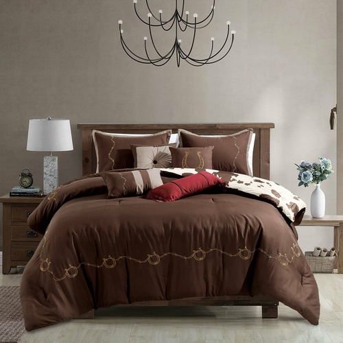 Introducing the Reversible Cowhide Lovers Brown Horseshoe Comforter Set, a luxurious 7-piece bedding ensemble designed to elevate your bedroom decor. This stunning comforter set features a unique blend of creamy off-white and tawny brown colors, creating a warm and inviting atmosphere. The eye-catching horseshoe and cowhide print adds a touch of Western charm, making it perfect for those who appreciate rustic elegance.