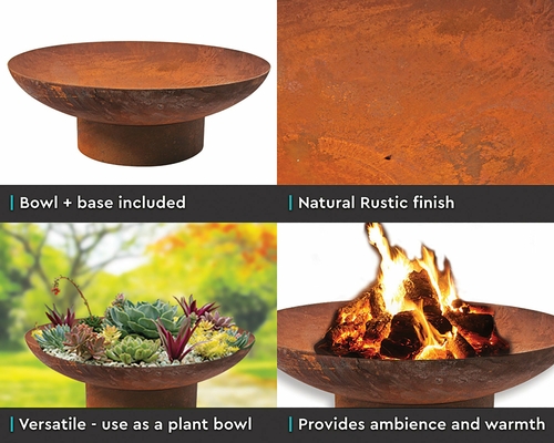 This stunning naturally rusted finish will add texture and style to your backyard and it's dimensions make it a multi-purpose item, you can use it for a cozy fire pit, plant holder, watering bowl or bird bath!