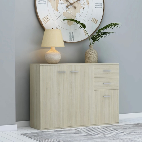 With 2 doors and 3 drawers, the sideboard provides ample storage space for books, multimedia appliances and other items. The sturdy tabletop is ideal for displaying decorative objects, photo frames, or potted plants. Thanks to the premium board material, this sideboard is built to last. Additionally, the drawer cabinet is easy to clean with a damp cloth. This item is easy to assemble.