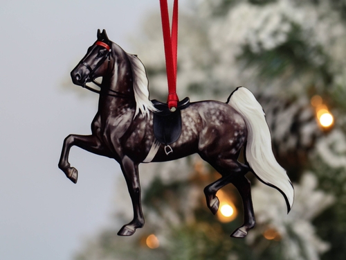 Introducing the exquisite Silver Dapple Saddle Seat Horse Ornament, a must-have for any equestrian enthusiast looking to add a touch of charm to their holiday decor. This beautifully handcrafted ornament is made from high-quality composite wood, ensuring durability and a stunning finish. With its intricate laser-cut design, this ornament captures the essence of the beloved Saddlebred horse, making it a perfect addition to your Christmas tree or any festive display.