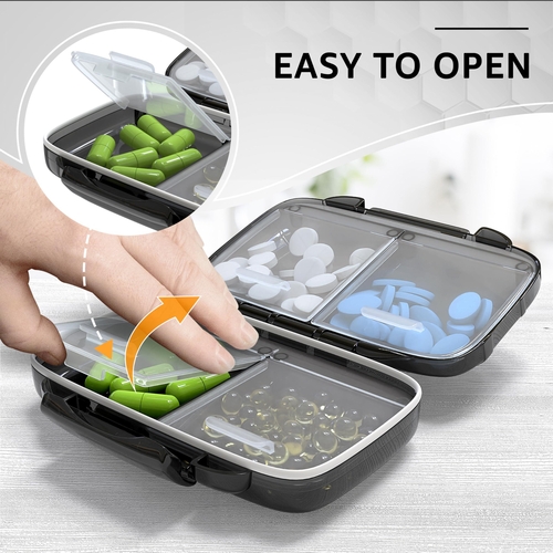 EASY TO OPEN: The lids of individual compartments in this portable pill container feature large tabs for easy opening. It is effortless to fill or retrieve tablets, even for those with weak hands