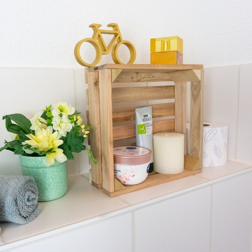 This solid wood storage box is crafted from reclaimed wood pallets. Through a meticulous process of recycling and expert craftsmanship in Germany, the pallets are transformed into stunning new pieces for your home. With its natural and captivating wood grain, the storage box effortlessly complements various interior styles and color schemes. It serves a multitude of purposes, whether it's storing food and fruits, organizing kitchen seasonings, or displaying potted flowers in your living space. Made from 100% natural wood the box is suitable for outdoor use as well. The larger sizes can be used as storage containers in the garden or you can put on your bicycle and store snacks and tableware when going on picnic trips. • Solid wood storage box