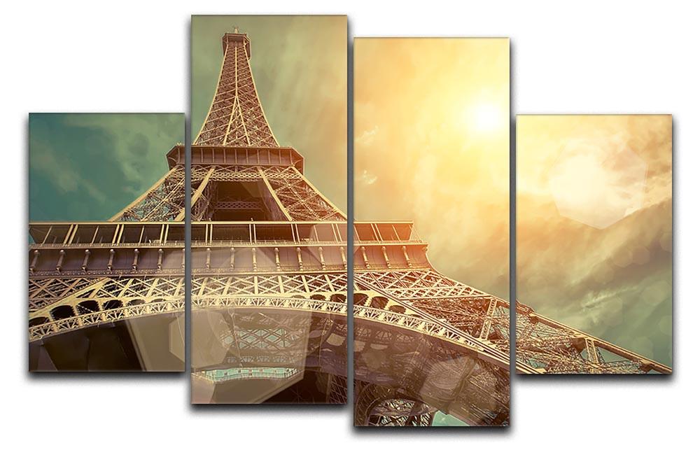 A beautiful 4 split panel canvas artwork featuring the Eiffel Tower illuminated by sunlight, showcasing vibrant colors and intricate details.