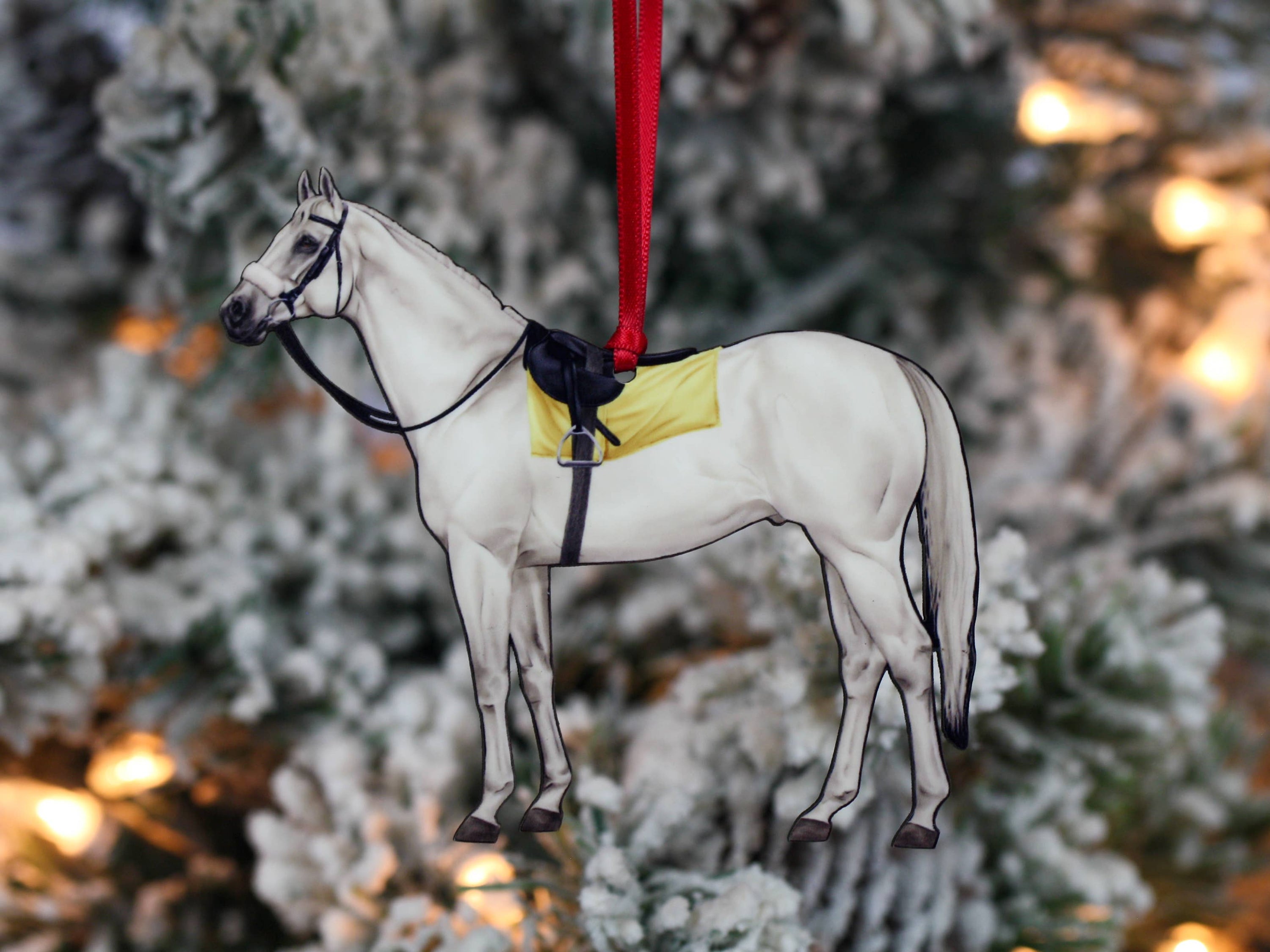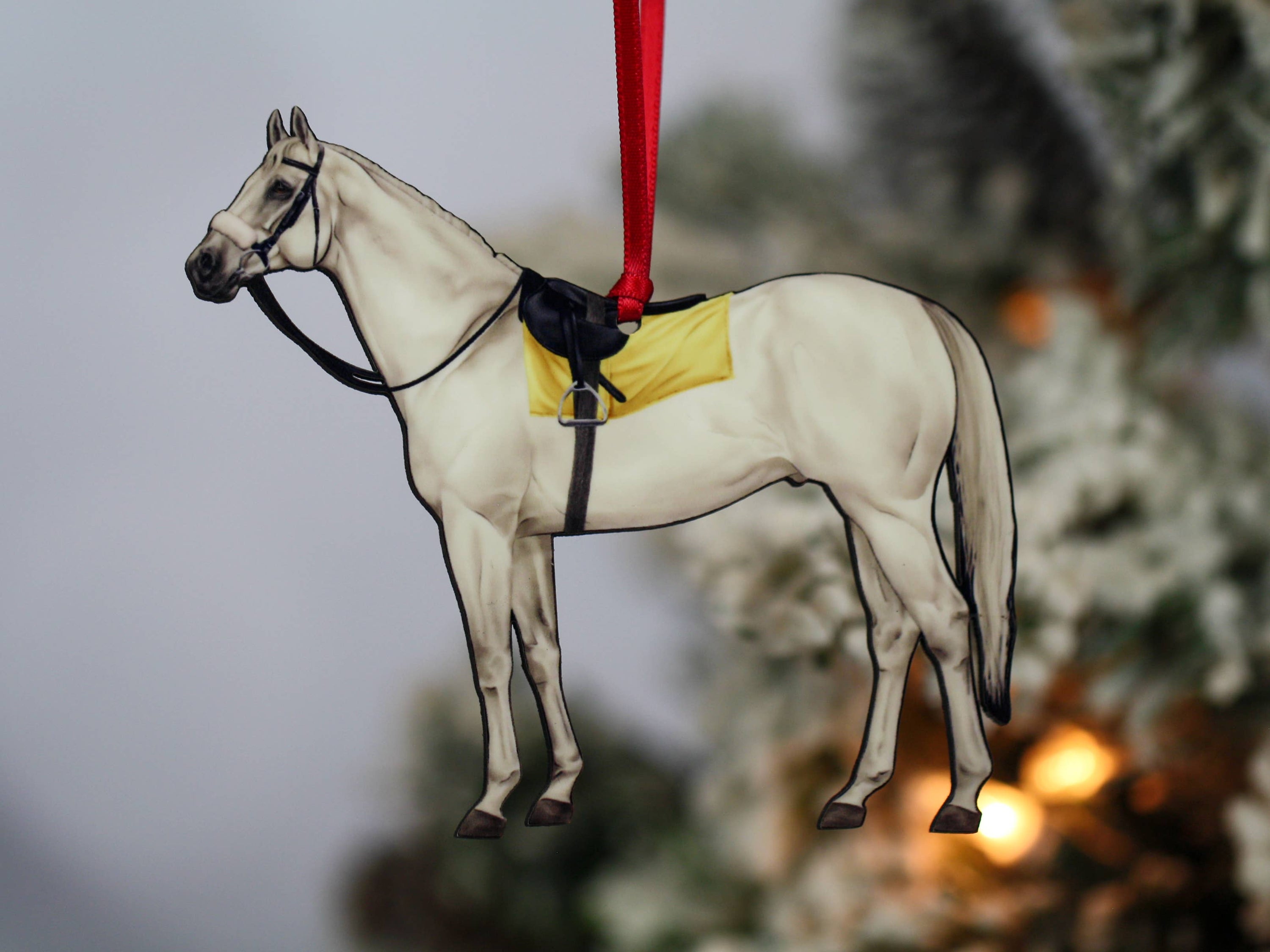 Introducing the stunning Thoroughbred Race Horse Ornament in white/light gray, a must-have for any equestrian enthusiast or horse lover. This beautifully crafted ornament is not just a decoration; it’s a piece of art that celebrates the elegance and spirit of Thoroughbred racehorses. Made from high-quality composite wood, this ornament is designed to last and bring joy for many holiday seasons to come.