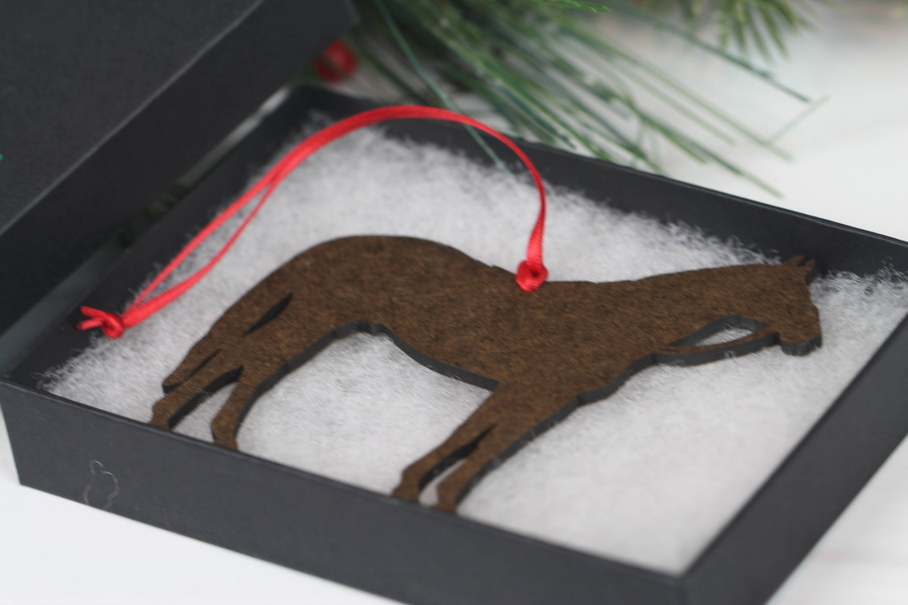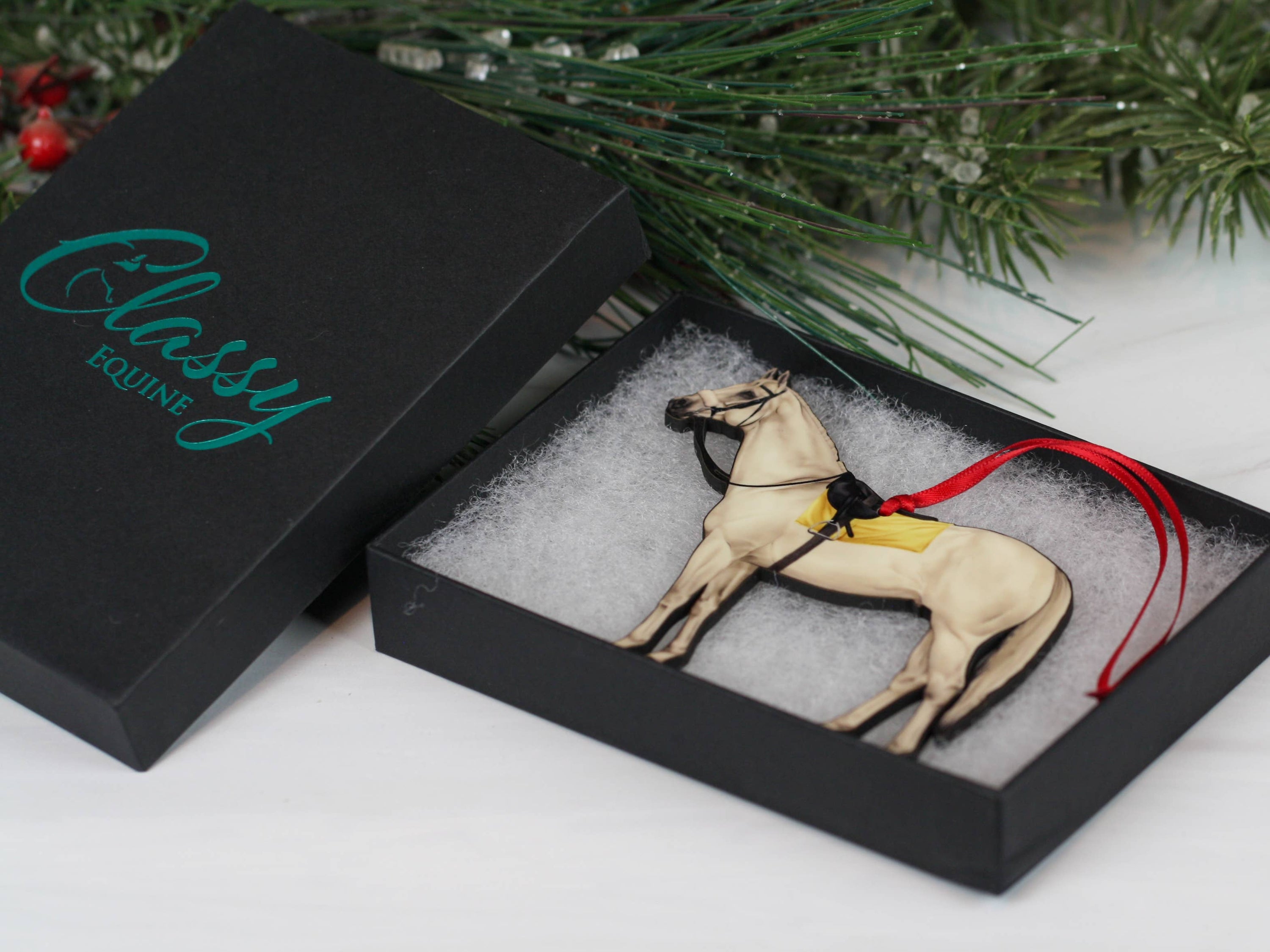 This Thoroughbred Race Horse ornament features a unique design created by Drop of Equine Art in collaboration with Classy Equine. The intricate details and craftsmanship make this ornament stand out, whether it’s displayed on a Christmas tree, mantel, or wall. The ornament measures 3.75 inches in width and 3.4 inches in height, making it the perfect size to catch the eye without overwhelming your decor.