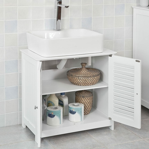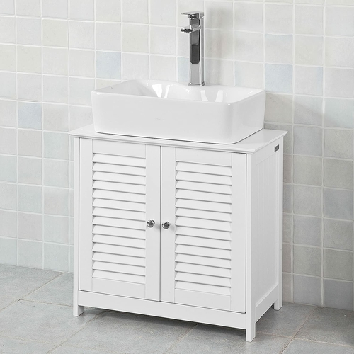 - White wooden base cabinet with sturdy frame construction. Simple, clean and practical(Basin not included).