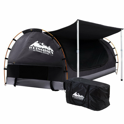 Weisshorn Double Swag Camping Swag, a spacious canvas tent with insect-proof mesh panels and durable aluminum poles, ideal for outdoor camping.
