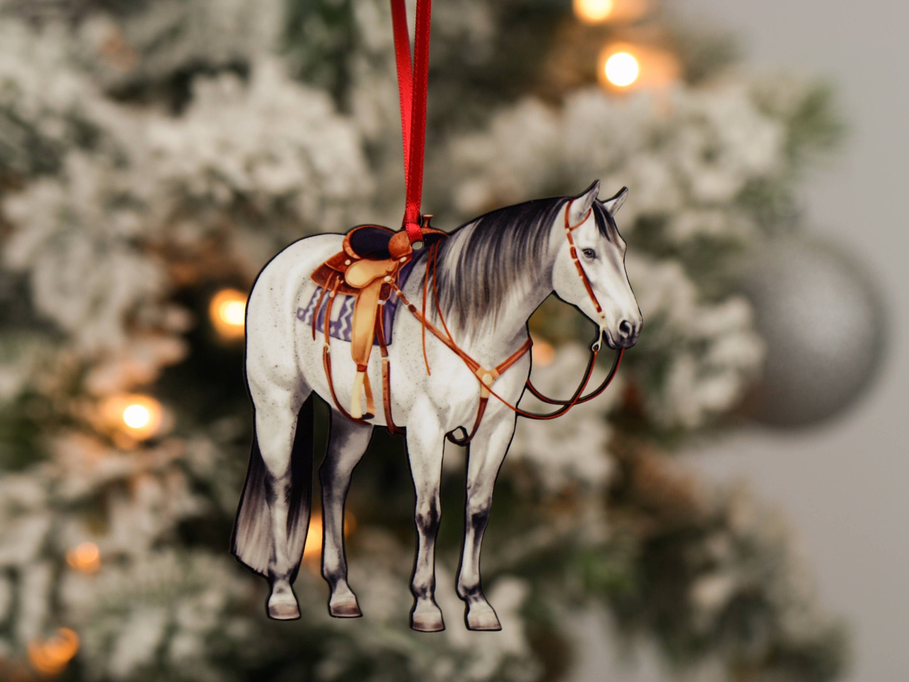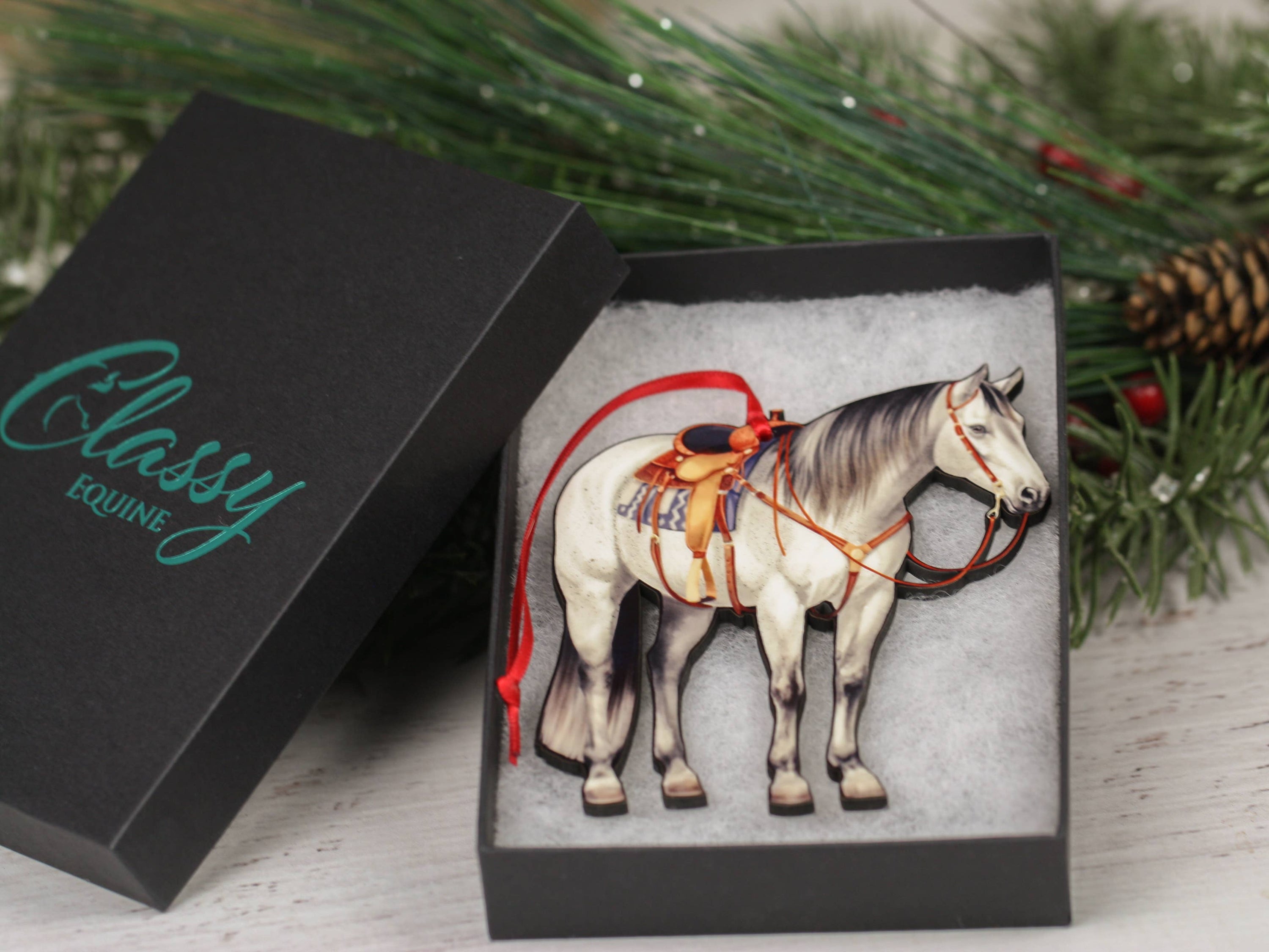 Our Gray Quarter Horse Christmas Ornament is exclusive to Classy Equine, ensuring that you are purchasing a one-of-a-kind piece that cannot be found elsewhere. This ornament is a perfect representation of the bond between horse lovers and their equine companions, making it a meaningful addition to any collection.