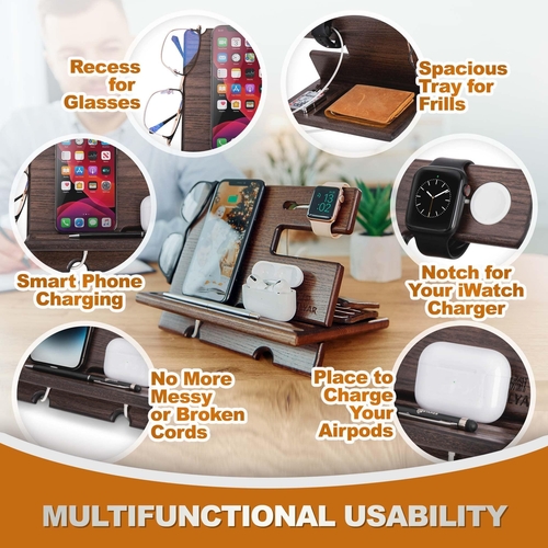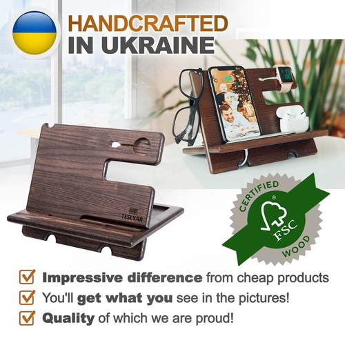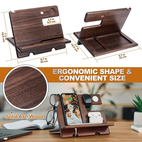 MULTIFUNCTIONAL 3 IN 1 CHARGING STATION & ORGANIZER. harge your cell phone, Apple Watch and AirPods, always keeping them at hand. Size assembled 221918 cm/8.7x7,5x7". Please note: accessories shown in the photo are not included! 100% NATURAL & ECO FRIENDLY. This stand is made of SOLID ASH-TREE and covered with non-toxic protective finishing. Please note! Ash-tree has a very beautiful, unique structure, therefore, the color of the item you bought may be slightly different from the samples on the photo. 100 % QUALITY. STRONG & STURDY. For making these stands we use only the best high-quality solid wood. The surface is smoothly polished and covered with durable finishing. Perfectly fits into any interior - both classical and modern styles. SMART DESIGN. CORDS MENAGEMENT. The stand is easy to assemble (assembly manual attached). Convenient cutouts will prevent the cables from bending. The stand also has compartments for wallets, watches, pen/pensils, keys, stationary, coins etc. BEST GIFT IDEA. GIFT BOX. Surprise your Husband, Dad, Son, Boyfriend, Brother, your friend, co-worker or Boss. Best gift for Christmas, Birthday, Fathers day, Anniversary, Graduation. The stand is packed in eco-friendly rustic-style gift box.