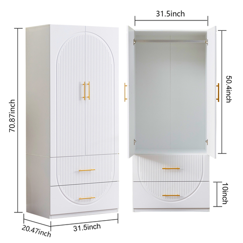 • [Size and Assembly] - The wardrobe is packed in one box. Overall dimensions: 31.5" Width x 20.4" Depth x 74.2" Height. This bedroom wardrobe features two doors and drawers, and it requires two-person assembly. It includes step-by-step instructions and all necessary hardware.