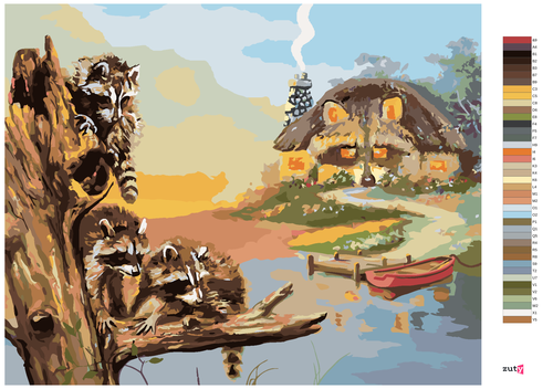 Dropship Zuty - Paint by Numbers - RACCOON ON A LOG, PIER WITH BOAT AND HUT (D.