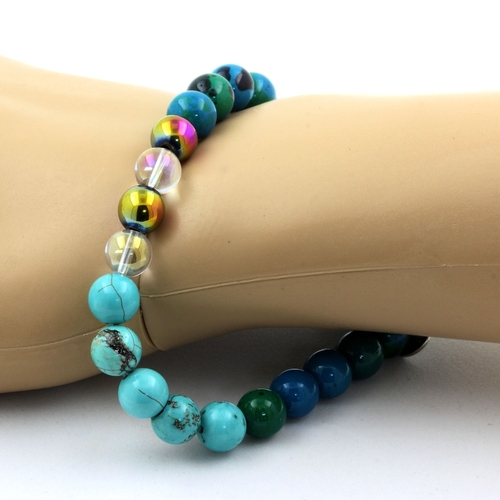 Chrysocolla + Turquoise + Titanium Quartz + Multicolor Hematite Bracelet 8 mm Beads. Length 19-20 cm. Comes in a box pouch. We can make it to your length on request. Made in France in our A Bijoux workshop.