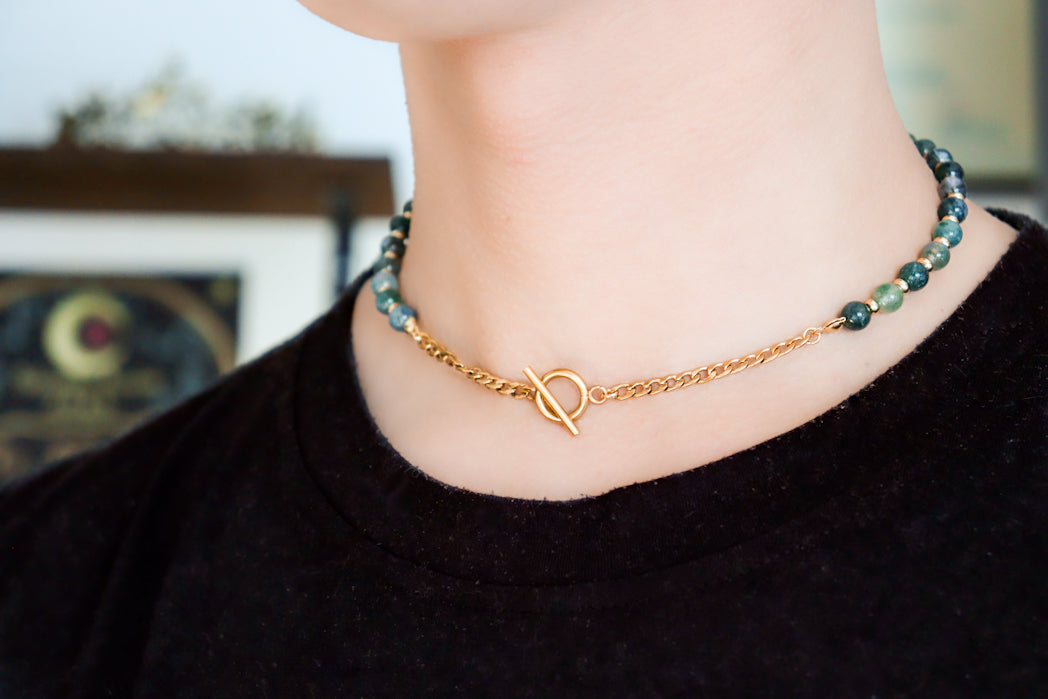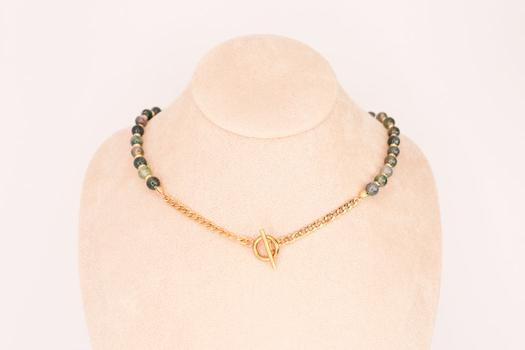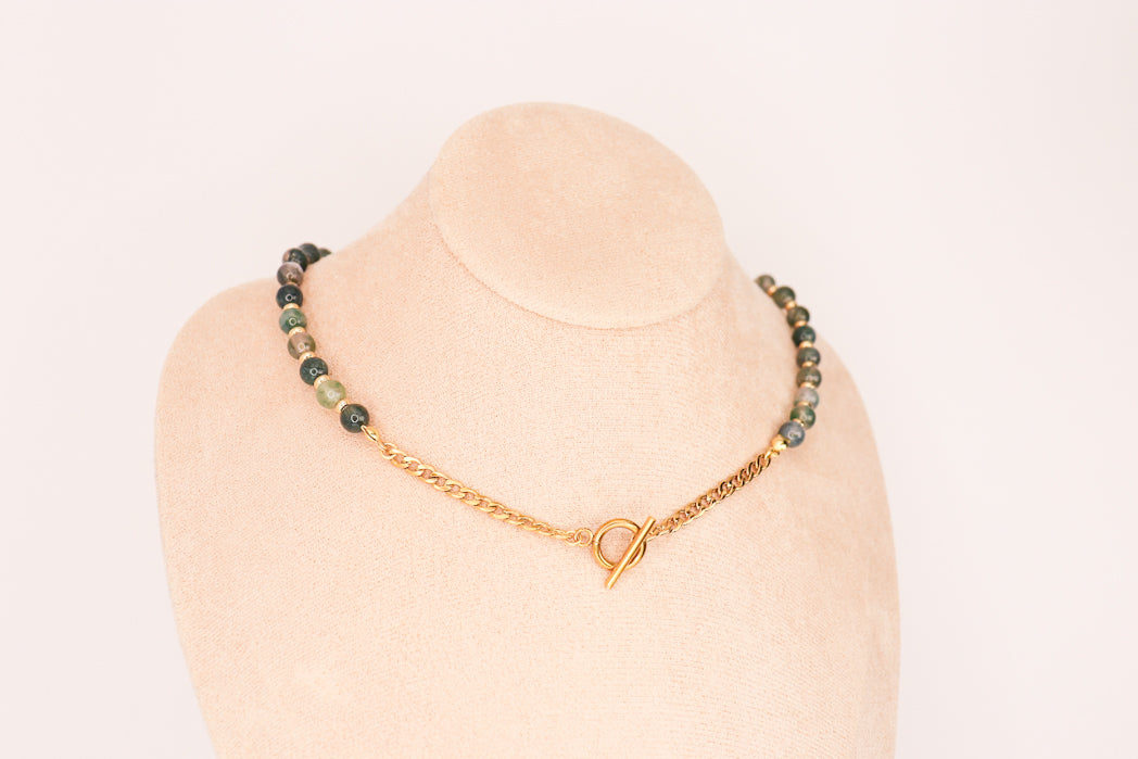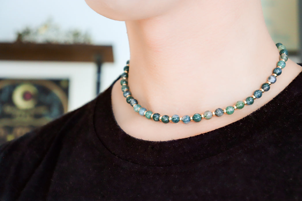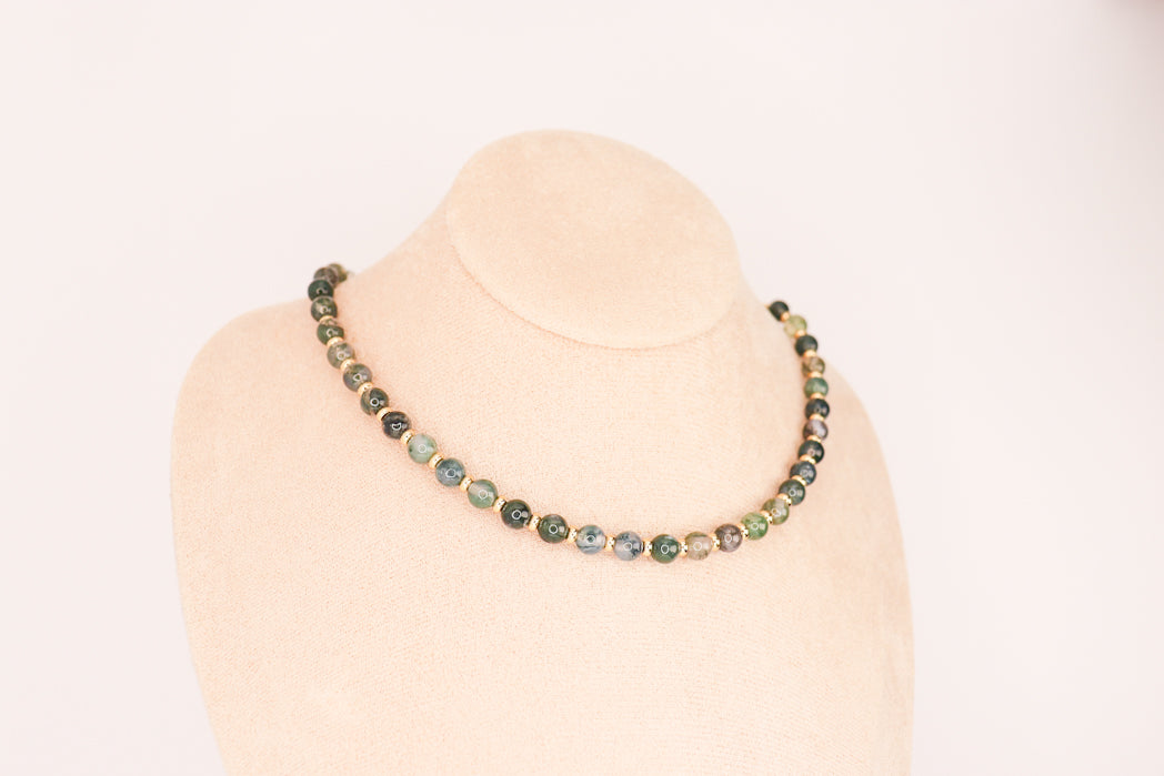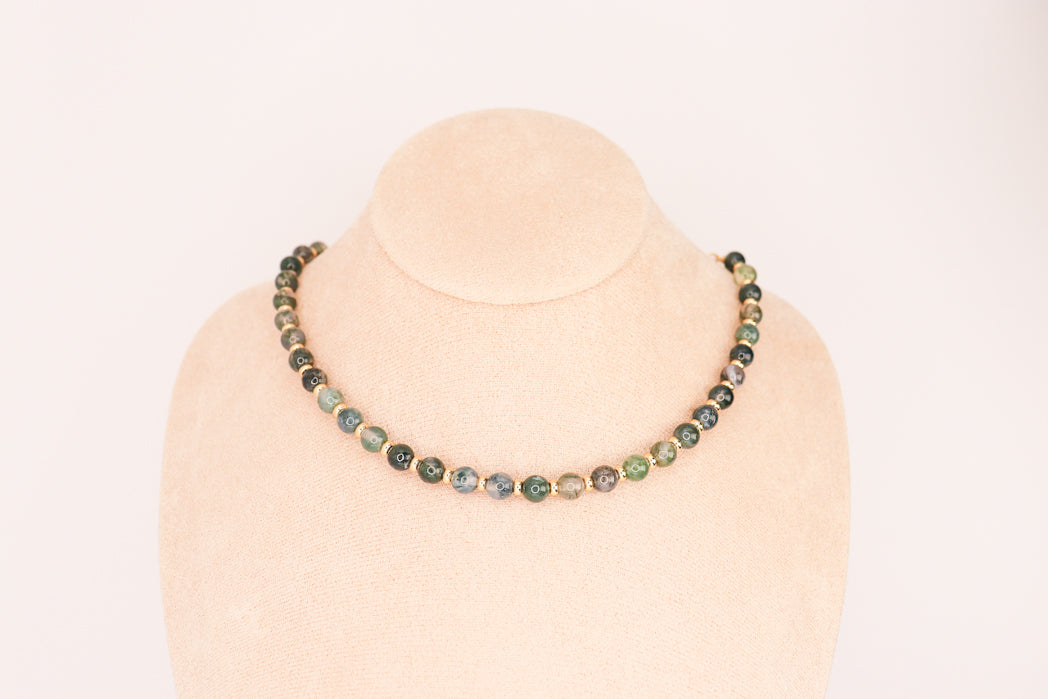 Le collier est composé de perles d'Agate mousse naturelles de 6 mm, avec des apprêts en acier inoxydable plaqué Or véritable 24 carats et un fermoir en acier inoxydable plaqué Or 18 carats. Le fil d'acier doré est enrobé de nylon, garantissant ainsi la solidité et la durabilité du bijou. Chaque pièce est unique, et les aspérités naturelles des pierres ajoutent à leur charme.