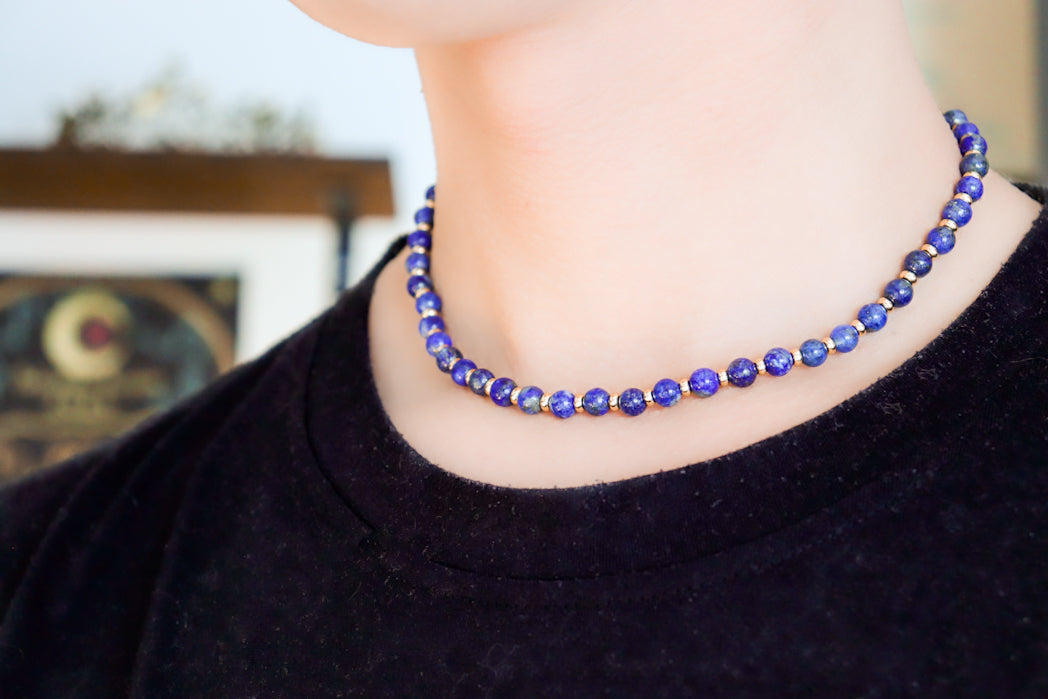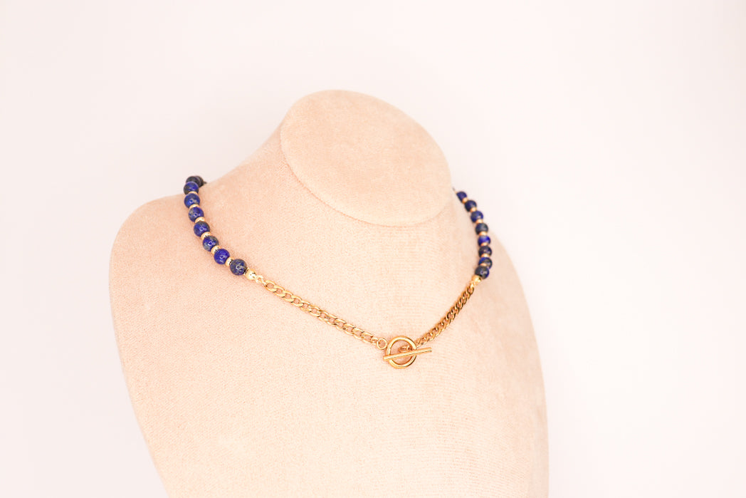 Ce collier est composé de perles de Lapis lazuli naturelles, d'apprêts en acier inoxydable plaqué Or véritable de 24 carats, et d'un fermoir en acier inoxydable plaqué Or de 18 carats. Le fil d'acier doré enrobé de nylon assure la durabilité et la résistance du bijou. Chaque perle est unique et peut présenter des aspérités naturelles, ce qui ajoute à son charme authentique.