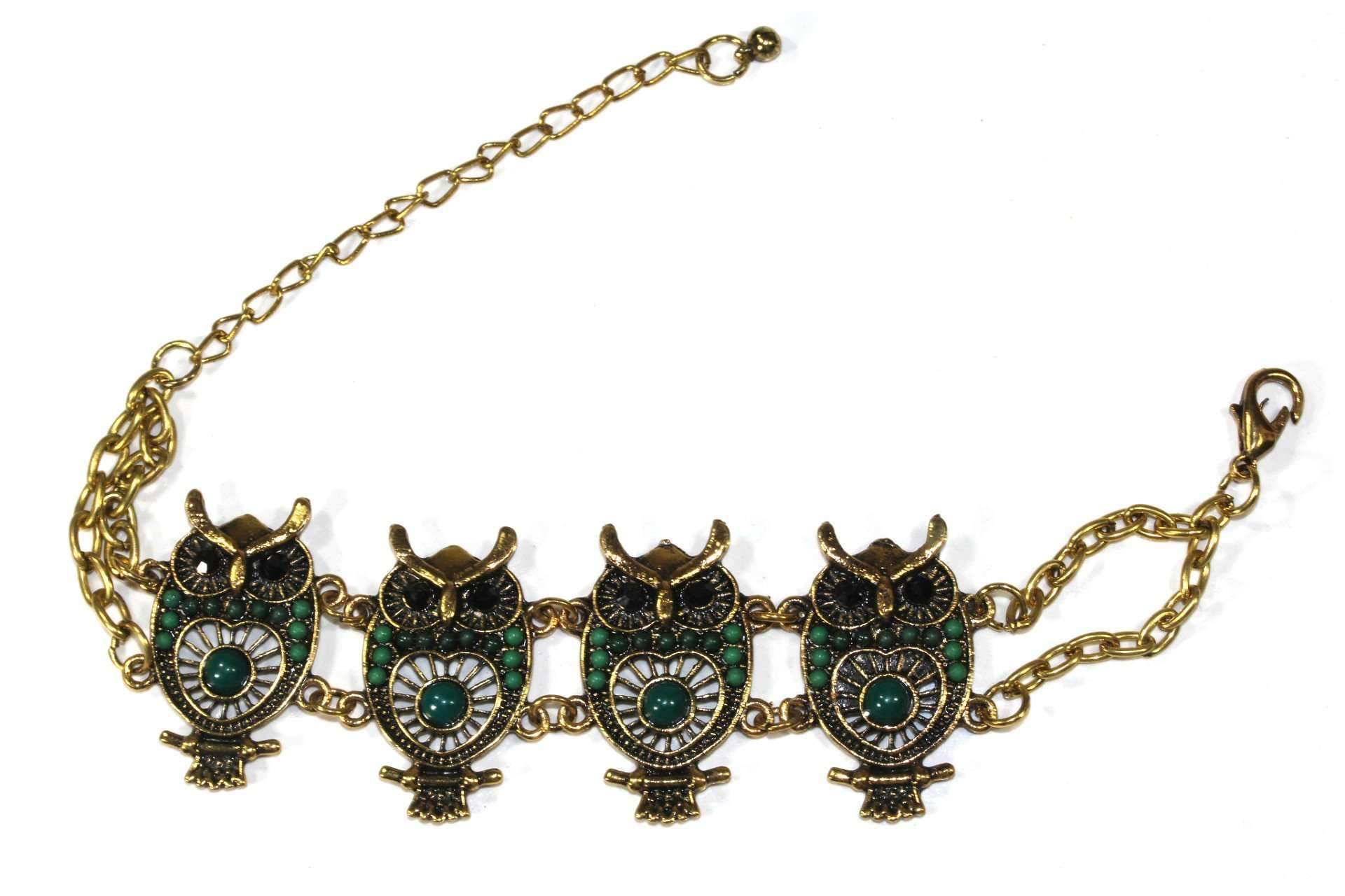 This bracelet showcases four beautifully crafted owl charms that are intricately detailed, making each piece a work of art. The colorful bead drops surrounding the charms add a playful touch, creating a vibrant contrast against the gold tone. The heart-shaped belly of the bracelet enhances its charm, making it a perfect gift for loved ones or a special treat for yourself.